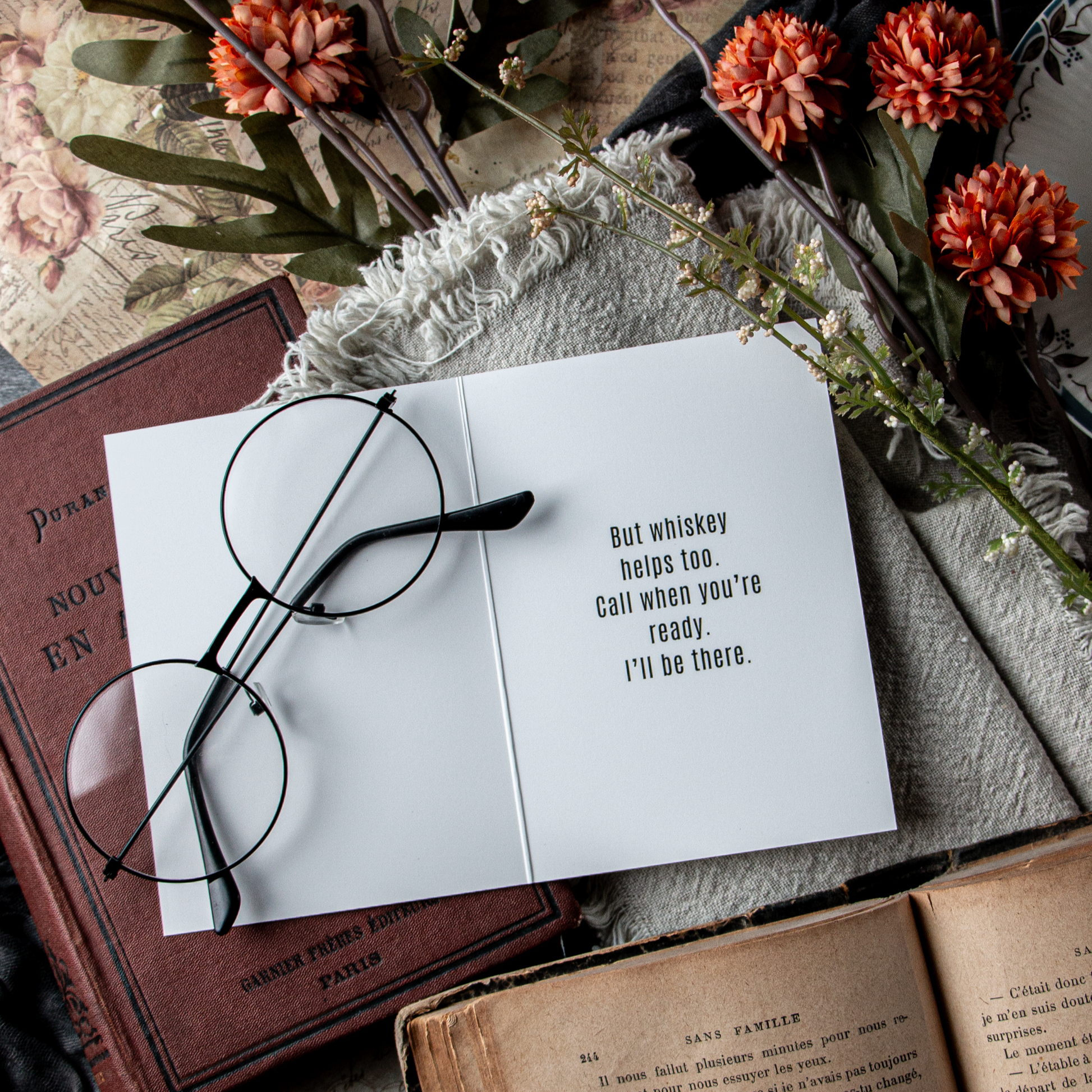 Inside: “But whiskey helps too. Call when you’re ready. I’ll be there.”